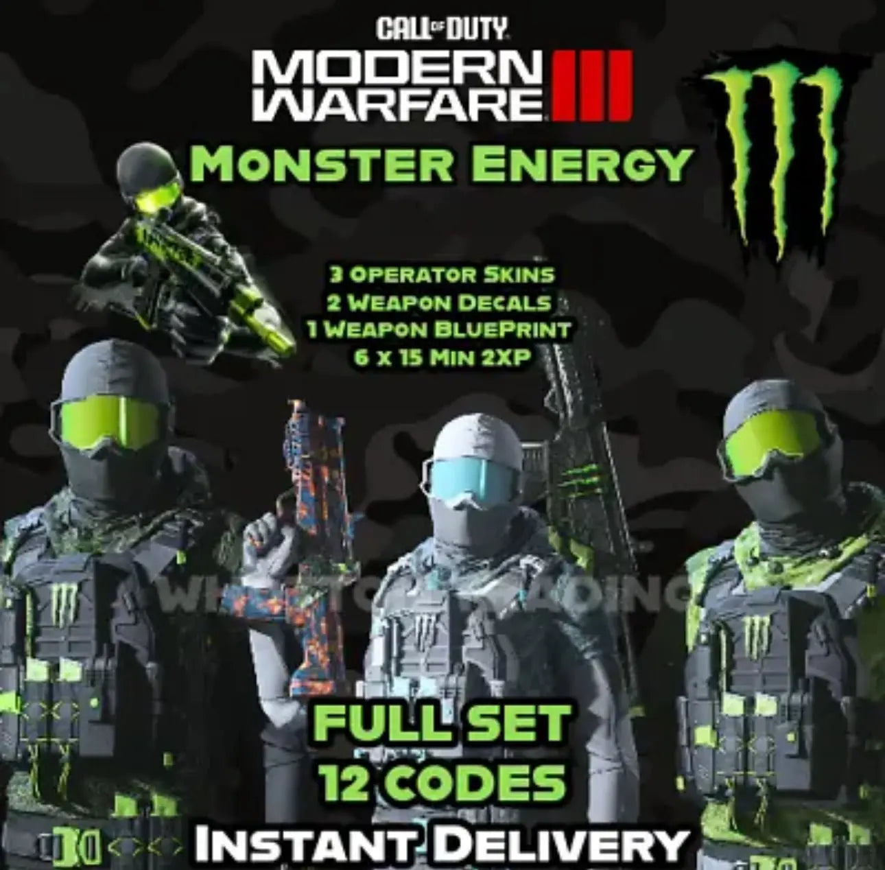 The Modern Warfare 3 Monster Energy Items are highly exclusive and can be used in MW3 and Warzone 3. When you order, you will receive 12 codes that unlock amazing in-game content. These codes include unique operator skins, weapon blueprints, weapon camos, and double XP codes for a full gaming experience.