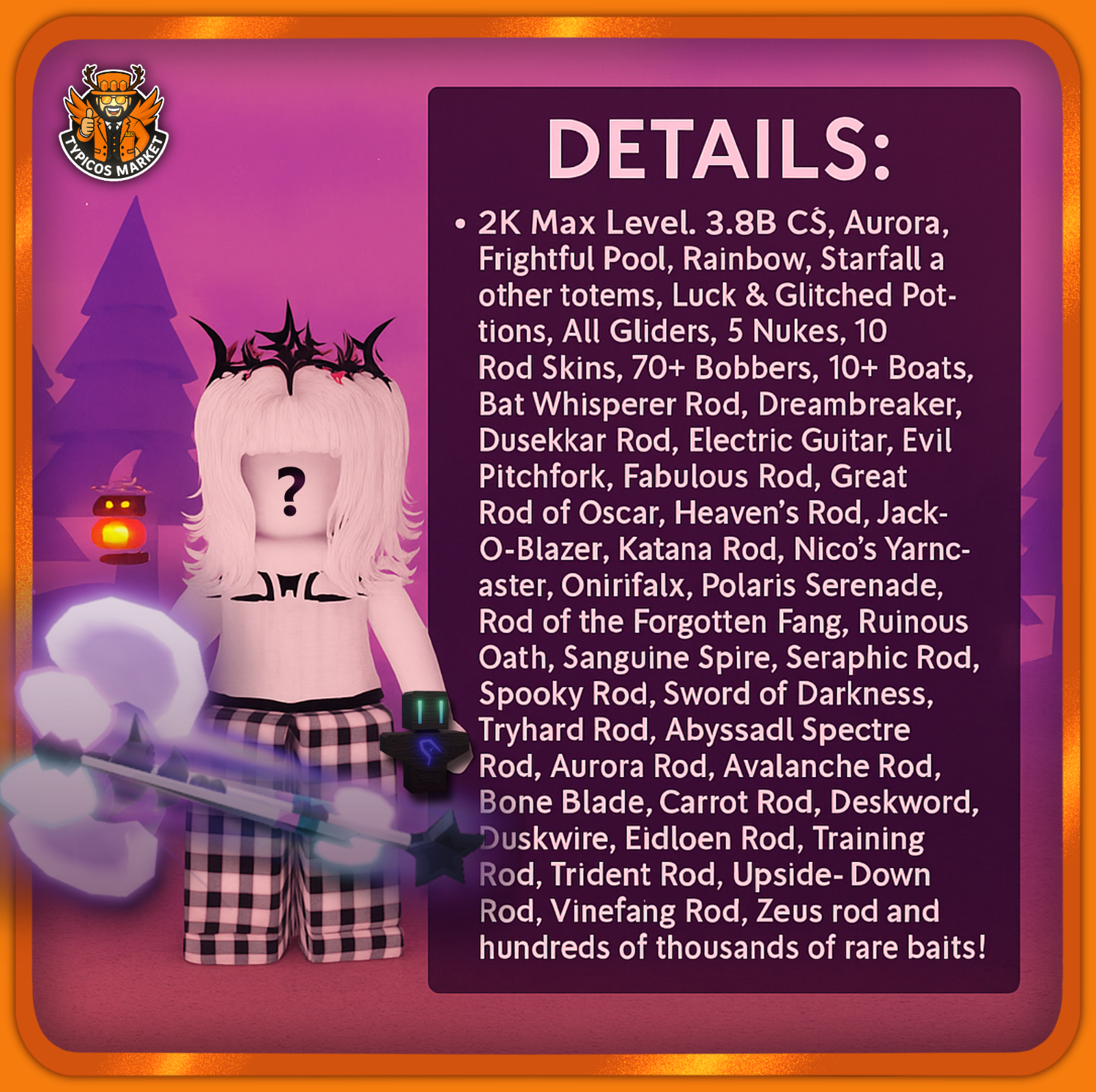 DETAILS: 2K Max Level, 3.8B C$, Aurora, Frightful Pool, Rainbow, Starfall and other totems, Luck & Glitched Potions, All Gliders, 5 Nukes, 10 Rod Skins, 70+ Bobbers, 10+ Boats, Bat Whisperer Rod, Dreambreaker, Dusekkar Rod, Elder Mossripper, Electric Guitar, Evil Pitchfork, Fabulous Rod, Great Rod of Oscar, Heaven's Rod, Jack-O-Blazer, Katana Rod, Nates Blade, Nico's Yarncaster, Onirifalx, Polaris Serenade, Rod of the Forgotten Fang, Ruinous Oath, Sanguine Spire, Seraphic Rod, Spooky Rod, Sword of Darkness, Tryhard Rod, Abyssal Spectre Rod, Aurora Rod, Avalance Rod, Bone Blade, Carrot Rod, Cerulean Fang Rod, Challenger's Rod, Champions Rod, Cinder Block Rod, Depthseeker Rod, Destiny Rod, Duskwire, Eidolon Rod, Etheral Prism Rod, Flimsy Rod, Frostbane Rod, Great Dreamer Rod, Kings Rod, Kraken Rod, Leviathan's Fang Rod, Long Rod, Lucid Rod, Lucky Rod, Luminescent Rod, Magnet Rod, Midas Rod, Mythical Rod, No-Life Rod, Nocturnal Rod, Original No-Life Rod, Phoenix Rod, Plastic Rod, Poseidon Rod, Rainbow Cluster Rod, Random Rod, Rapid Rod, Reinforced Rod, Rod of the Depths, Rod of the Zenith, Scarlet Spincaster Rod, Scurcy Rod, Steady Rod, Stone Rod, Summit Rod, Sunken Rod, Tempest Rod, The Boom Ball, Training Rod, Trident Rod, Upside-Down Rod, Vinefang Rod, Volcanic Rod, Wicked Fang Rod, Wildflower Rod, Zeus rod and hundreds of thousands of rare baits! 100% safe and fast!