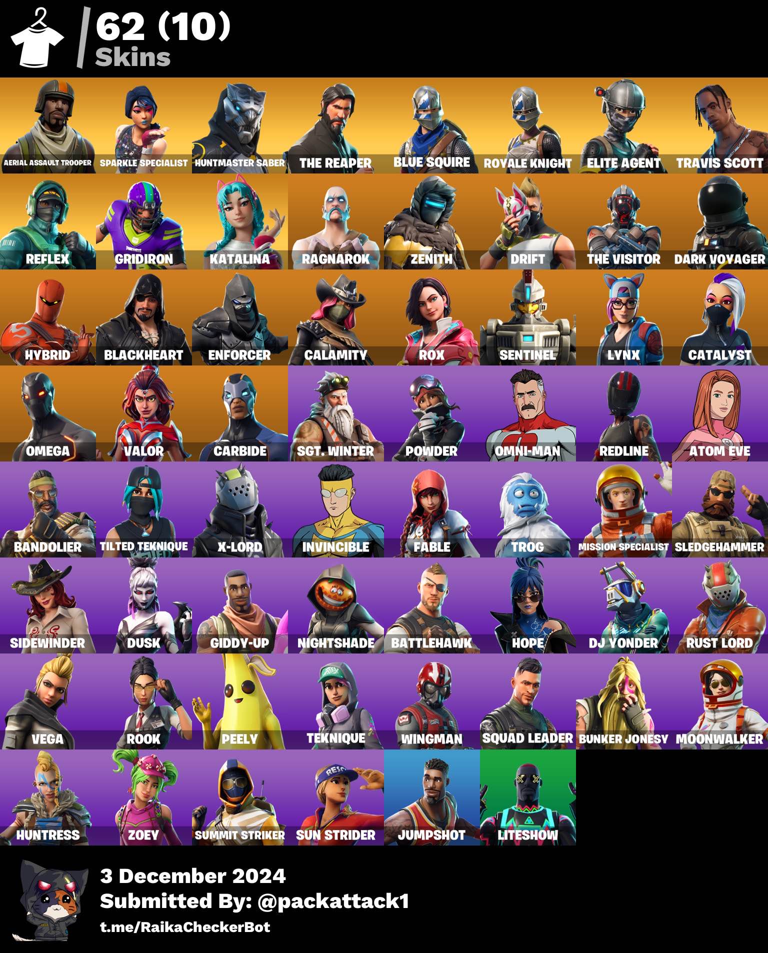- 62 skins, 59 gliders, 60 backpacks & 48 Pickaxes