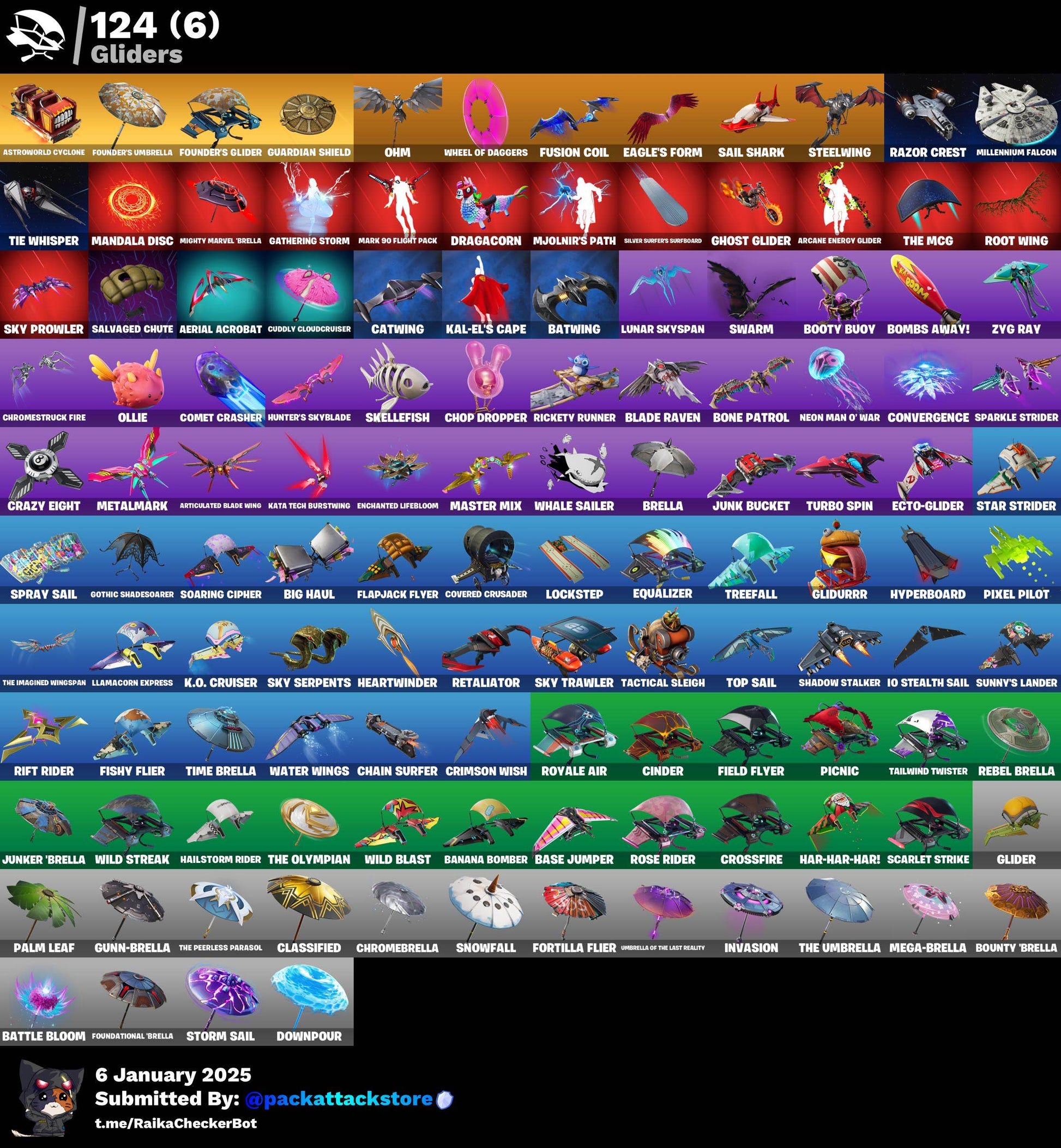- 188 skins, 124 gliders, 195 backpacks & 148 Pickaxes